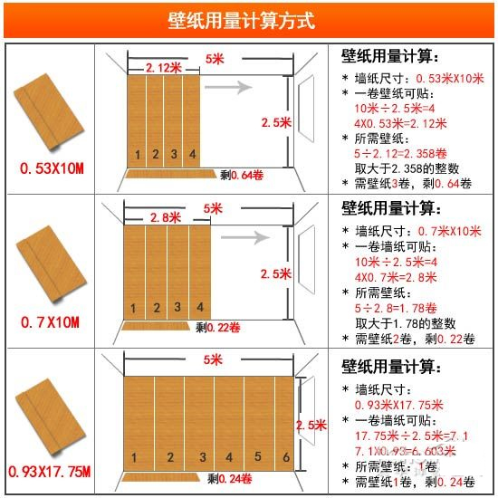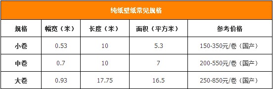 在選擇壁紙的時(shí)候,除了要看適用空間外,還需要看空間的面積,根據(jù)實(shí)際的面積來挑選不同尺寸的壁紙。純紙壁紙的常見尺寸有三種,0.53x10米/卷、0.7x10米/卷和0.93x17.75米/卷。如:一個(gè)5mx2.5m的墻面鋪貼壁紙,小卷壁紙需要購買3卷、而中卷需要2卷、大卷的需要1卷。