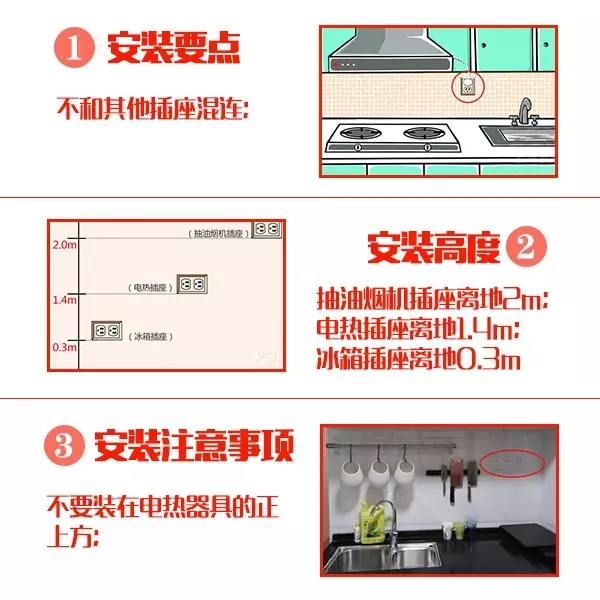廚房內(nèi)所用電器較多,所以在進行電路改造時,一定要想清楚廚房內(nèi)會有哪些電器,具體位置在哪里,想好哪里應(yīng)該預(yù)留電線接口,廚房應(yīng)根據(jù)建筑裝修的布置,在不同的位置、高度設(shè)置多處電源插座以滿足抽油煙機、消毒柜、微波爐、電飯煲、電熱水器、電冰箱等多種電炊具設(shè)備的需要。這樣就不會留下裝修遺憾。