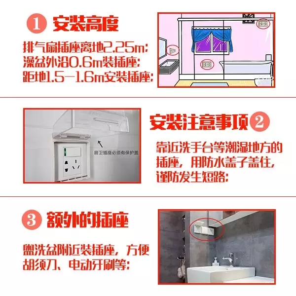 安裝在衛(wèi)生間的插座宜帶開關(guān)和指示燈,如果安裝在潮濕位置的插座,好在插座表面安裝一個防水的蓋子,避免水汽進入插座內(nèi),引起短路。