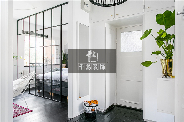可以明顯看出,客廳與臥室只用了一道黑框玻璃門隔斷,透明光感增加了整體環(huán)境的通透性,但黑色的框線卻強調(diào)了兩個空間,線條明朗交錯之間,既有北歐風的自由風情,又有輕工業(yè)的規(guī)整有序,這種輕微卻極具沖擊力的混搭效果讓人眼前一亮。