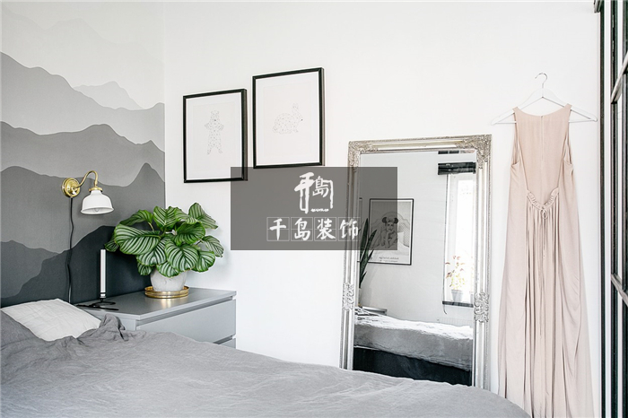 無論是灰白黑等冷色調(diào)的運用,還是大片的空間留白,臥室內(nèi)部更多地還是彰顯出濃郁的北歐風情。但巧妙地將色澤變化運用其中,墻壁一面由深及淺的灰色增加了空間的層次感,另一面用黑框裝飾畫強調(diào)北歐風主題,其中金屬壁燈的點綴便不顯突兀又獨具魅力了。