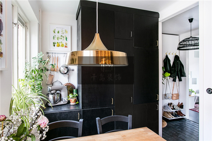 用餐區(qū)域仍然選擇了工業(yè)風十足的金屬吊燈,寬大的燈罩豐富了空間,但纖細的燈線卻不會讓頂部顯得過于壓抑。且餐桌及餐椅則都選用了實木材質(zhì),與有著窗戶的那面白墻相互照應(yīng),僅僅用一面裝飾畫、幾株綠植便帶來充滿自然氣息的北歐風情,瞬間柔和了用餐的氛圍。