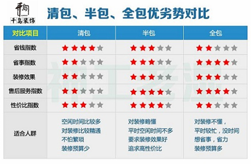 裝修前首先要搞清楚幾個裝修形式的概念,清包、半包、全包還有現(xiàn)在的主流整裝概念。每件事都各有它的兩面或者多面性,利或弊,好或壞。清包很省錢,全包很省力,半包則介于兩者之間,這也是為什么很多人會選擇半包的主要原因。