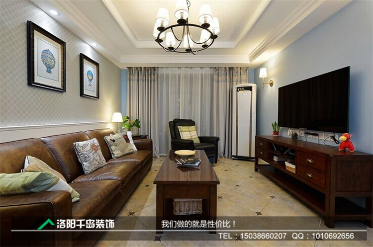 一般的美式大多咖啡色,屋主喜歡淡色系,于是有了淡淡的美式,原木深棕色茶幾,電視柜,多了一份沉穩(wěn)大氣。進(jìn)門對(duì)面的一堵墻,屋主做了很大的功夫,最后做了一個(gè)柜子,上面懸掛著一副裝飾畫,簡潔美觀。