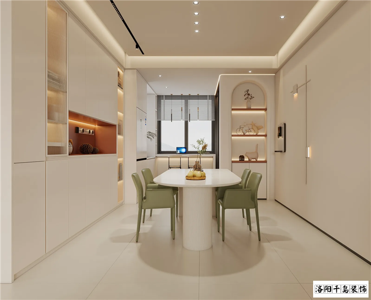整個餐廳與原有的生活陽臺打通,通過定制柜子將生活陽臺納入餐廳空間,讓餐廳更加的通透大氣,同時也增加了餐廳和收納盒活動空間,并且在原有生活陽臺靠窗位置設(shè)計了一個小吧臺,充分利用了每一出空間!
