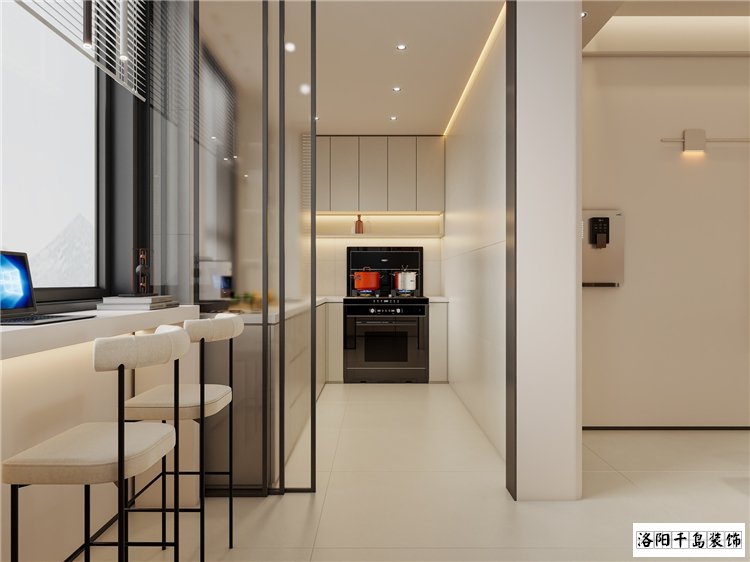 廚房洗切炒依次排開,采用集成灶,頂部的位置也做了吊柜,增加廚房收納,三聯(lián)動的極窄邊框推拉門,連著這餐廳的吧臺,功能性非常強(qiáng)大!