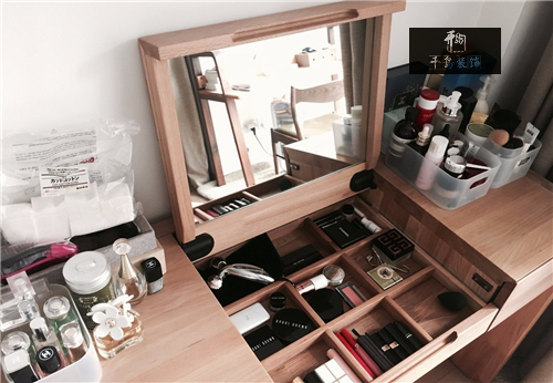 不喜歡臥室有鏡子,所以當(dāng)時特意找了這種鏡子可以關(guān)上的梳妝臺。自帶的分隔欄很好用。