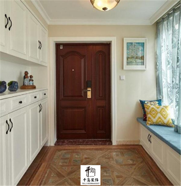 玄關(guān)處就設(shè)有一排儲(chǔ)物柜,下面放鞋子,柜子的對(duì)面就是一排長(zhǎng)椅,換鞋很方便輕松。