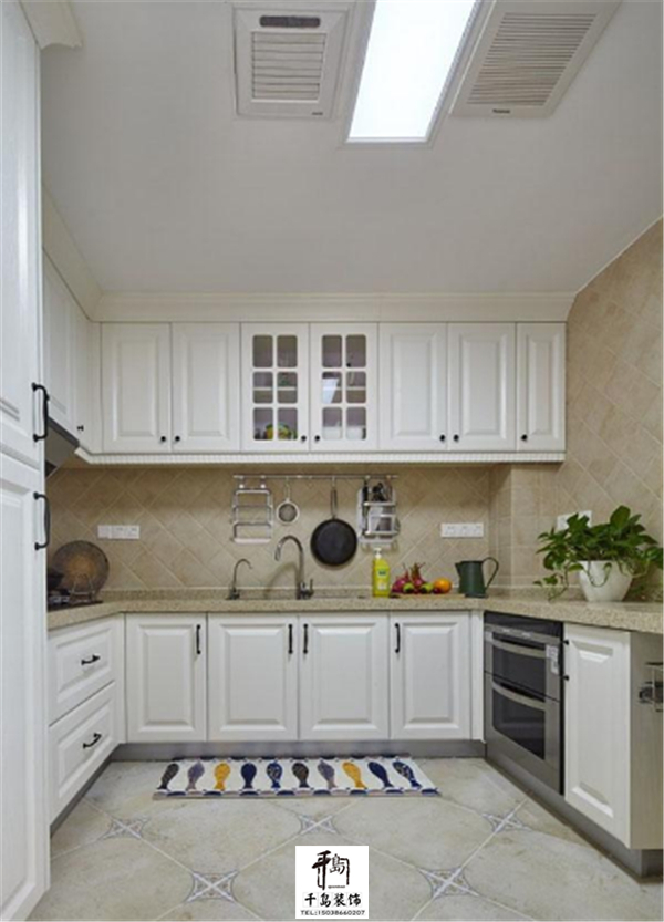 廚房是U型的設(shè)計(jì),櫥柜也是很多啊,這么一來(lái)廚具餐具都不愁沒(méi)地方放了!