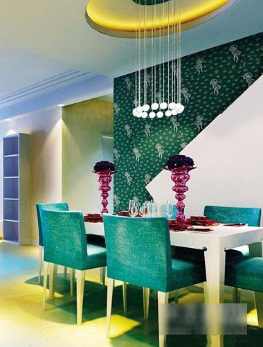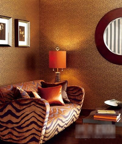 造型獨特的斑馬紋沙發(fā)透著奢華,紅色的臺燈有一種宮燈的韻味,在柔和的燈光和暖色墻紙的烘托下,讓客廳里的奢華氣氛慢慢彌散晚開來。